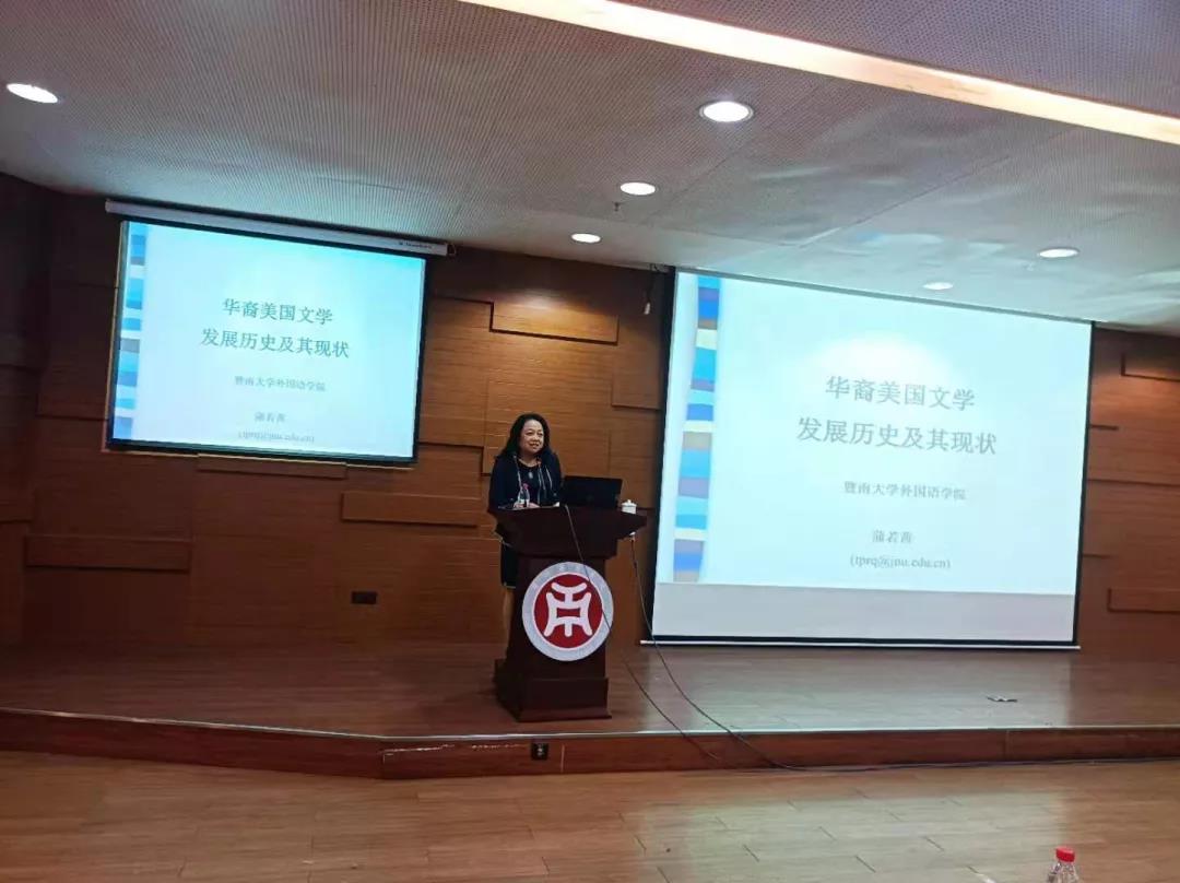 10月14日,暨南大学外国语学院比较文学与世界文学专业博士研究生导师蒲若茜教授在图书馆一楼学术报告厅为我校师生举办了一场题为“华裔美国文学的发展历史与现状”的讲座。讲座由我院副院长张丽教授主持。