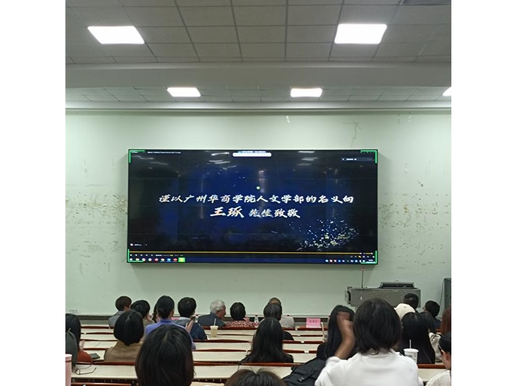 会议第二项议程,外国语学院副院长杜秀君教授发言。杜秀君副院长表示,非常感谢学校的关心与厚爱,感谢王琢教授担任外语系主任与外国语学院院长8年来作出的卓越贡献。她表示,担任副院长(主持工作)感到重任在肩,但有学校领导班子和人文学部的正确领航,只要学院上下持续发力,久久为功,我们必能取得成绩,不辜负学校的期望,只要我们以主人翁精神投入工作,我们就能从容迎接本科合格评估。杜副院长发言后,播放了一段视频,以广州华商人文学部的名义致敬王琢先生。
