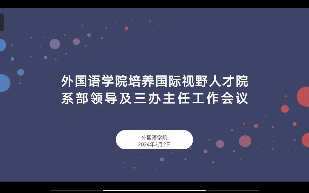 为积极配合学校开展培养国际视野人才工作,有效落实学校工作要求,扎实推进我院国际视野人才培养具体工作,2月2日下午3点,外国语学院召开了培养国际视野人才院系部领导及三办主任线上工作会议。外国语学院副院长(主持工作)杜秀君教授、副院长张丽教授,院长助理刘阳副教授、各系部主任及三办主任共20人参加会议。杜秀君教授主持会议。