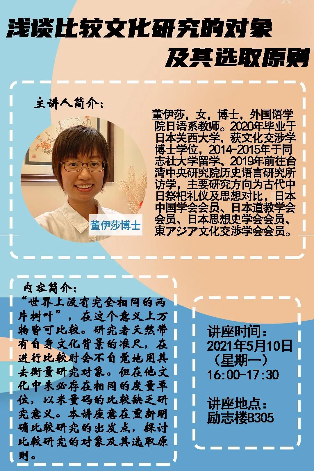 董伊莎,女,博士,外国语学院日语系教师。2020年毕业于日本关西大学,获文化交涉学博士学位,2014-2015年于同志社大学留学、2019年前往台湾中央研究院历史语言研究所访学,主要研究方向为古代中日祭祀礼仪及思想对比,日本中国学会会员、日本道教学会会员、日本思想史学会会员、東アジア文化交涉学会会员。