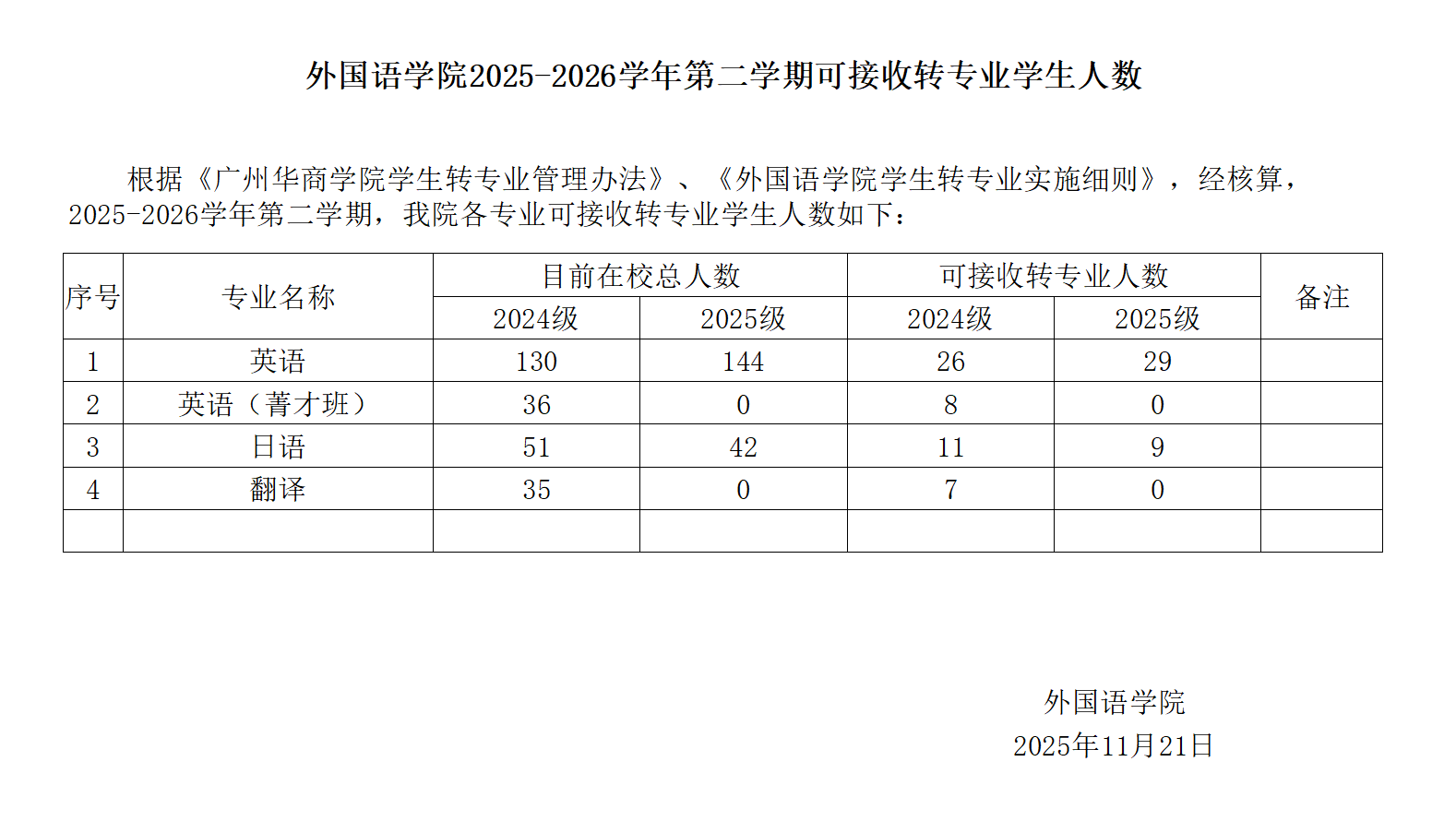 上一条:外国语学院2025-2026学年第二学期转专业录取结果公示 下一条:发布|外国语学院学生转专业实施细则
