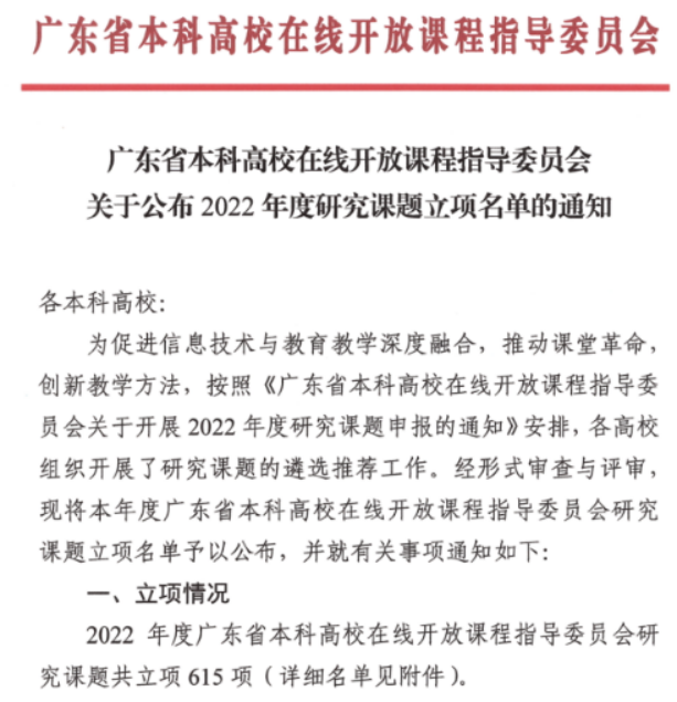 本次项目是广东省本科高校在线开放课程指导委员会在广东省教育厅指导下,开展的在线开放课程研究课题立项工作,旨在深入贯彻落实习近平总书记关于教育和数字中国建设的重要论述精神,以此促进高校信息技术与教育教学融合创新。我校将以本次立项项目建设为契机,立足学校教学改革实际,推动课堂教学革命,创新教学方法,突出问题导向、实践导向和应用导向,以项目建设为抓手服务好我校的信息化教学改革工作。
