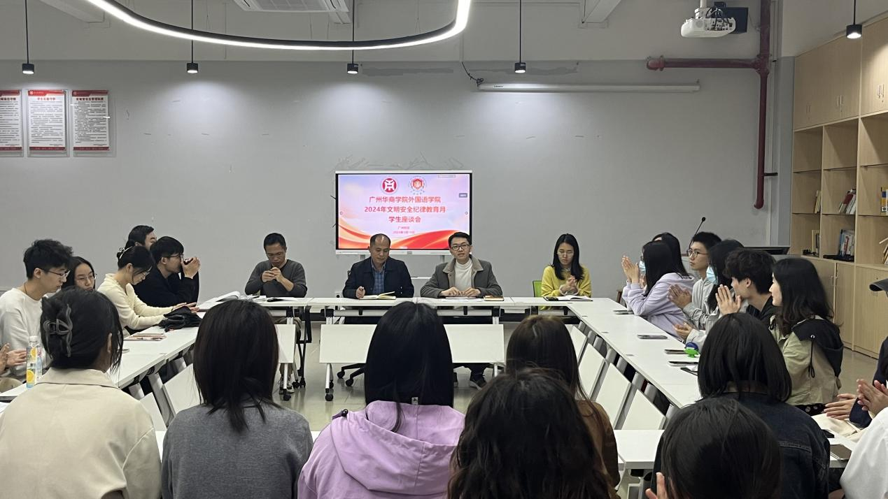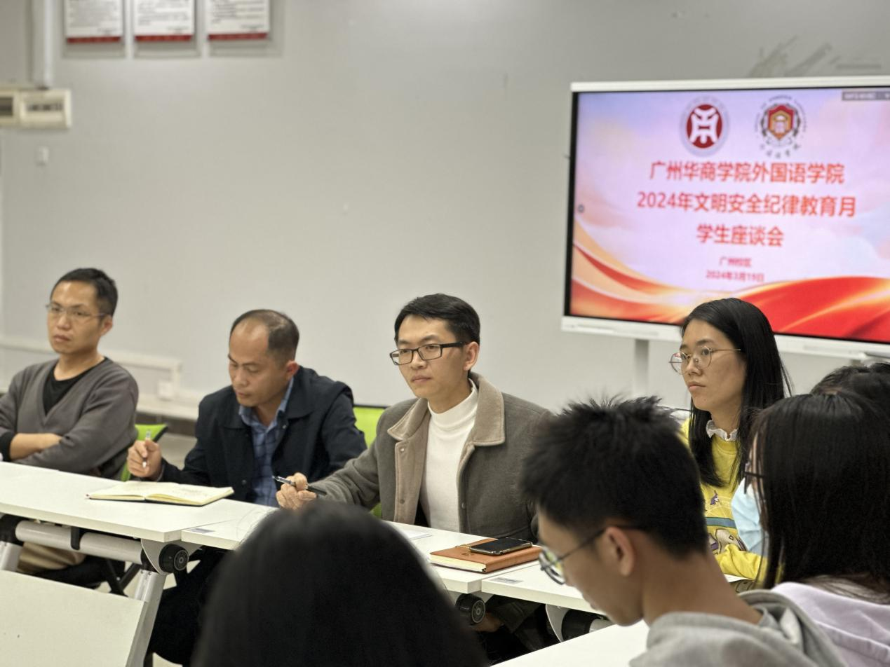 3月19日下午,为深入了解学生的思想、学习、生活状况,充分听取和征求学生对日常教学和管理的意见和建议,外国语学院在广州华商学院广州校区厚德楼B101召开了2024年文明安全纪律教育月学生座谈会,党委副书记兼副院长陈少鸿老师、学工办副主任何顺发老师、辅导员张超老师、张艳娥老师、江嘉丁老师以及兼职辅导员李怡静、陈冬梅出席本次会议。大会由何顺发老师主持。