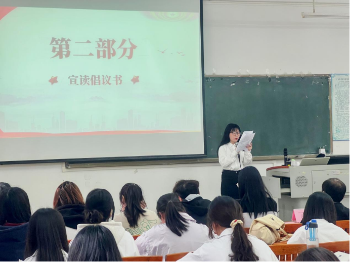 本次大会的主持人黄晓绚同学宣读外国语学院文明安全纪律教育月动员大会倡议书。