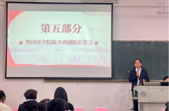 外国语学院副院长陈少鸿院长强调文明安全纪律教育月系列活动涉及到课室、宿舍、校内校外各个领域,与每位同学息息相关。同学们在学校要注意校园安全,例如:在宿舍注意用电安全,不使用大功率电器;在网络上要明辨是非,远离网络诈骗,并且举出生动的例子警醒各位同学;在校外不租用电动车、不乘坐黑车,注意出行安全。最后,陈院长指出各班干要积极维护班级的团结,发挥班干的先锋模范作用。