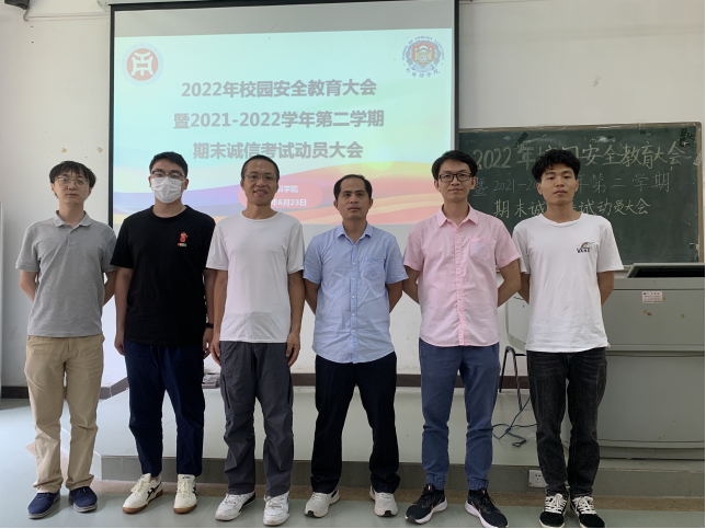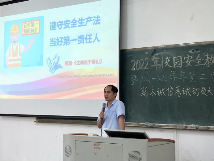 为了深化学生对校园安全的认识,加强学生的自我保护意识,进一步严肃期末考风考纪,引导学生诚信考试,外国语学院于2022年6月23日中午12:15在励志楼B104召开2022年校园安全教育暨2021-2022学年第二学期期末诚信考试动员大会,参会人员有外国语学院党委副书记兼副院长陈少鸿、学工办副主任何顺发、全体辅导员、各班班长、各大组织学生干部代表。