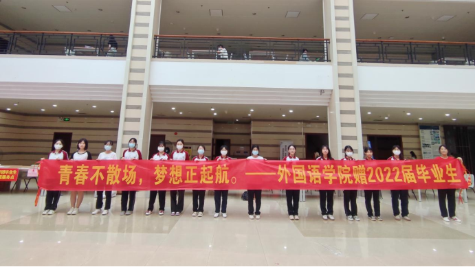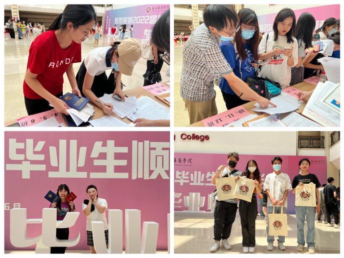 我院证书领取点位于图书馆一楼大厅,毕业生们进入图书馆后,按照顺序寻找自己的班级,领取毕业证书、学士学位证书、奖状、成绩单、党籍等材料;学院精心准备了印有“外国语学院”字样的帆布袋作为毕业纪念礼物。领取完物品后,毕业生们有序地在学校提供的毕业生卡牌及合影区拍照。