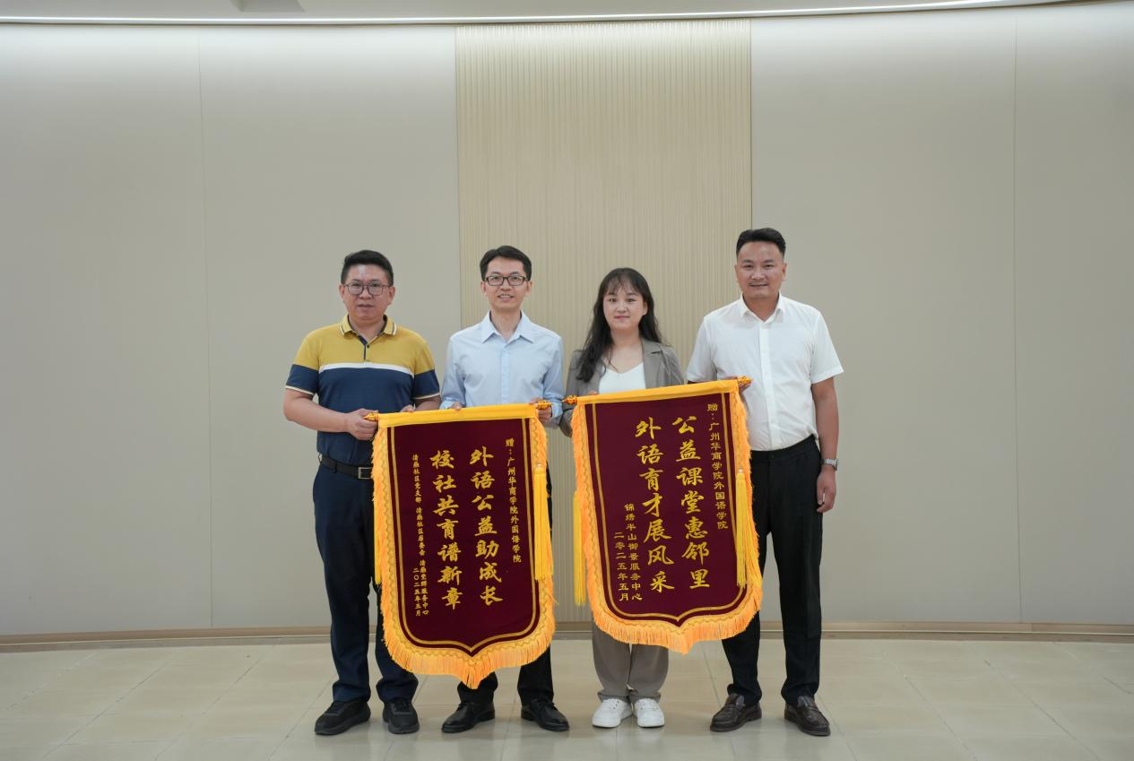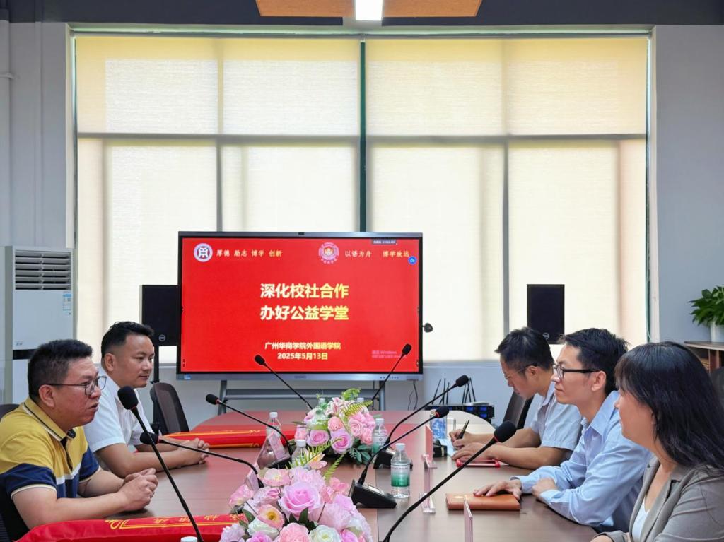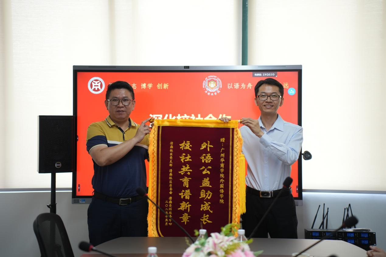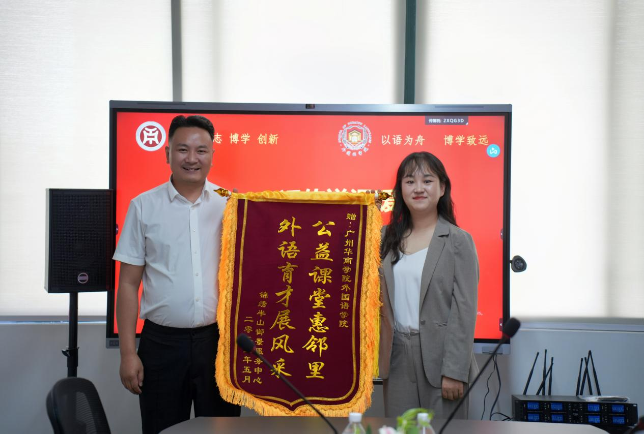5月13日上午,广州华商学院外国语学院与增城区清燕社区、锦绣半山御景花园小区物业联合举办的“晚风学堂”英语晚辅公益项目赠锦旗仪式在创新楼403-2小会议室举行。清燕社区邓镜波书记、锦绣半山御景花园小区物业陈勇经理、外国语学院何顺发副院长及“晚风学堂”项目组全体成员共同见证这一校社协同育人的温暖时刻。“晚风学堂”不仅体现了外院学子践行社会责任的热忱,更是校社双向奔赴、共筑教育公益新模式的生动缩影。