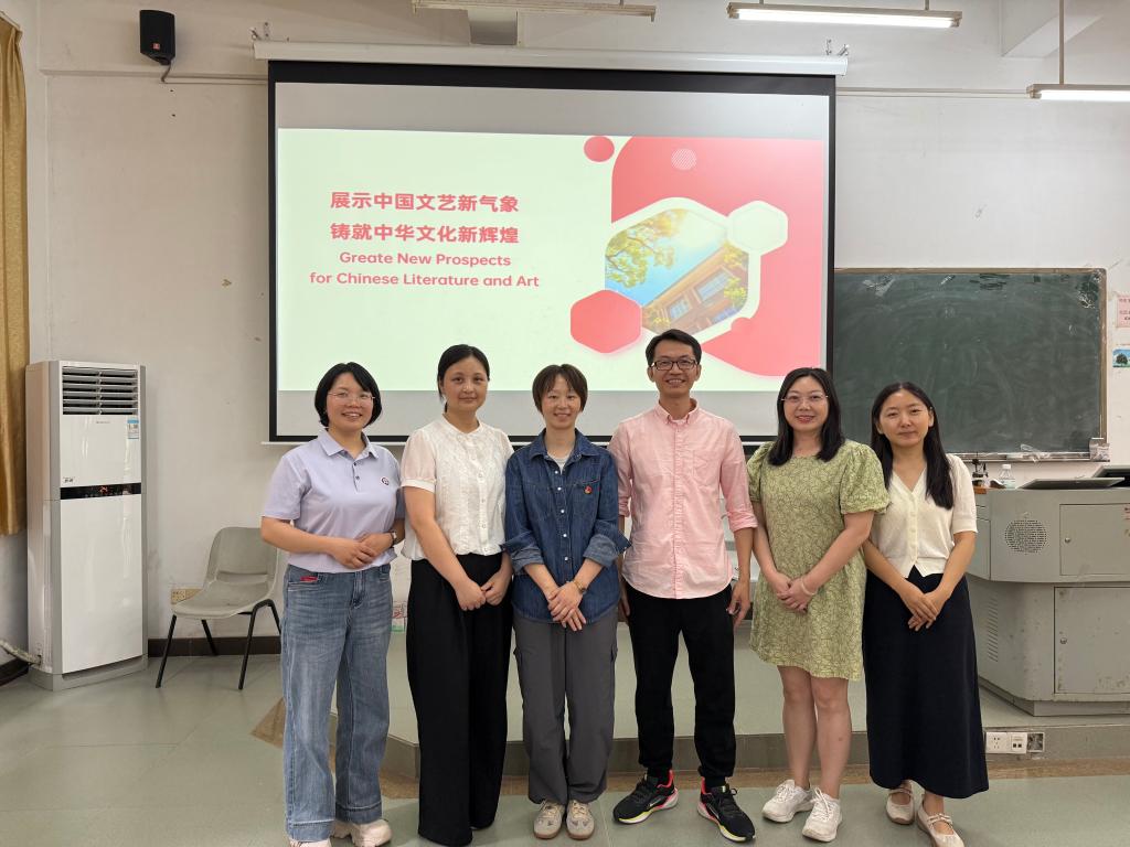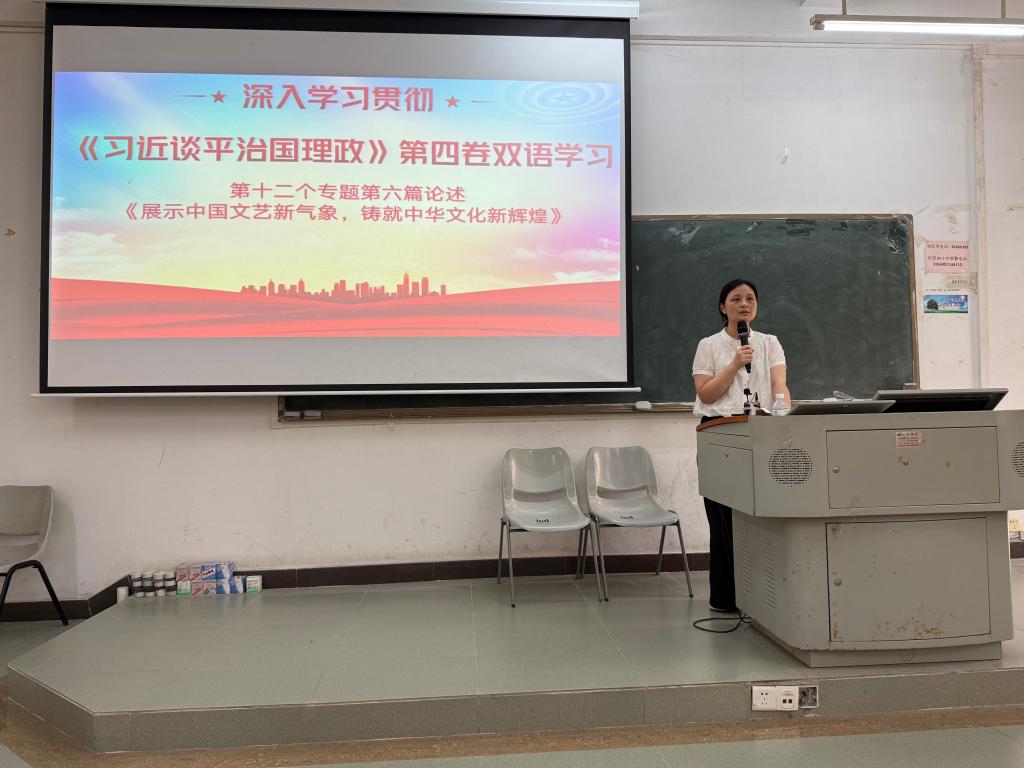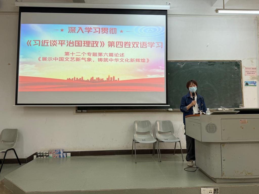 2025年5月27日下午,外国语学院党委第二期双语学习分享会在励志楼B104顺利召开,本期的内容为《习近平谈治国理政》第四卷之《展示中国文艺新气象、铸就中华文化新辉煌》重要论述。会议由外国语学院党委统战委员江雪同志主持,学院党委委员及各支部书记出席。